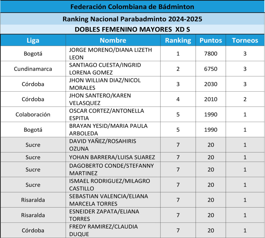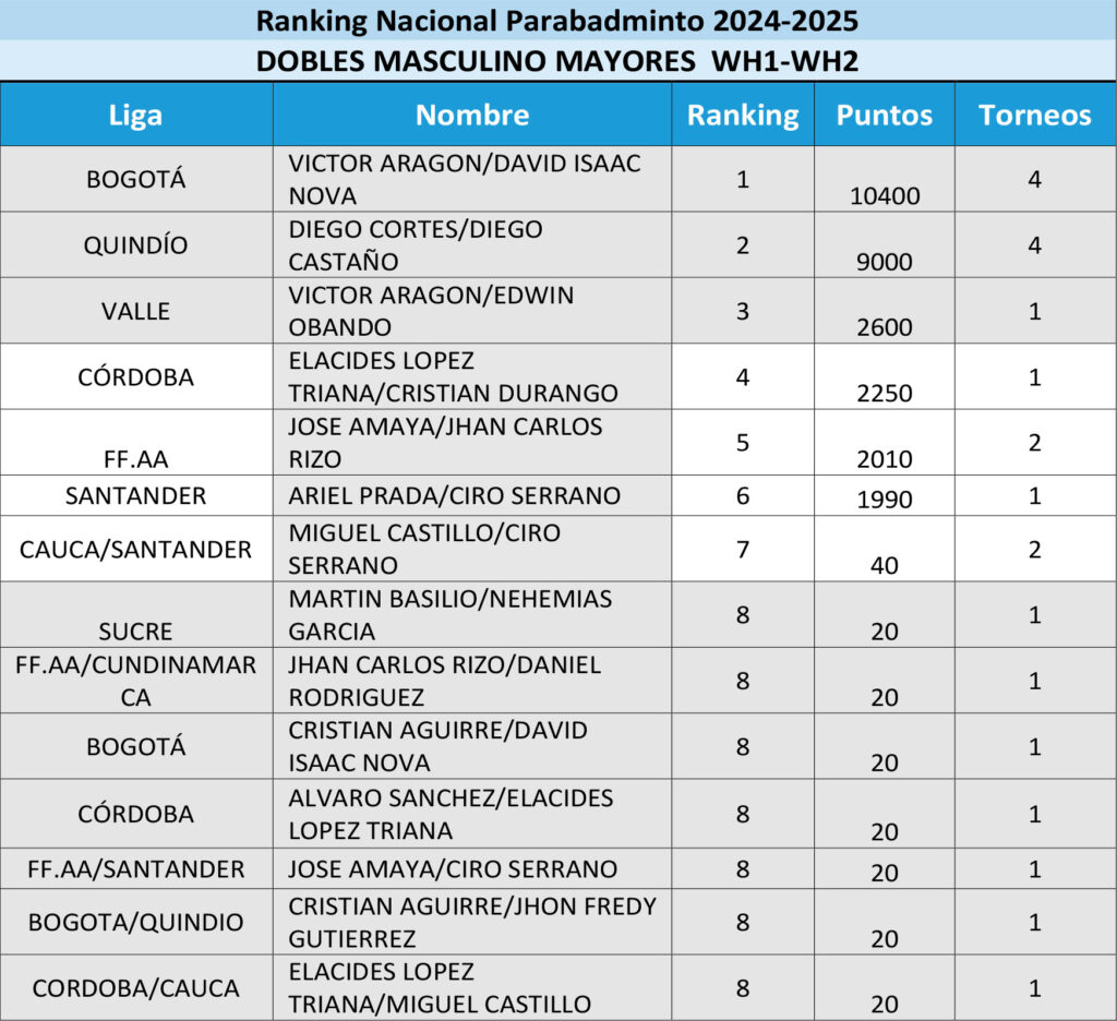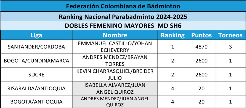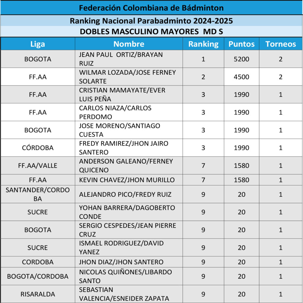 Ranking nacional Parabádminton Dobles 2024/ 2025